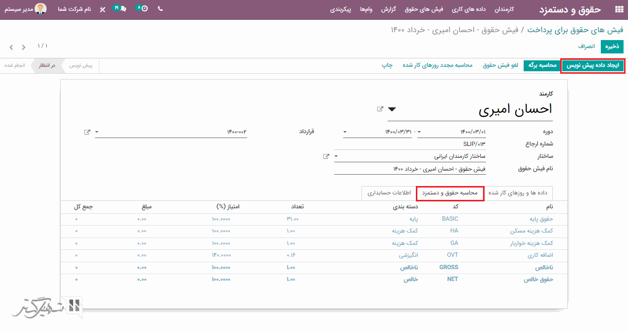 در تب "محاسبه حقوق و دستمزد"، جزئیات حقوق محاسبه خواهد شد. تغییرات را با کلیک بر روی دکمه "ذخیره" ، ذخیره کرده و سپس بر روی دکمه "ایجاد داده پیش نویس" کلیک کنید.