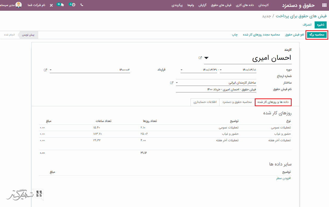 علاوه بر این، در تب داده ها و روزهای کار شده، روزهای کاری دیگر را اضافه کرده و سپس بر روی دکمه "محاسبه برگه" کلیک کنید: