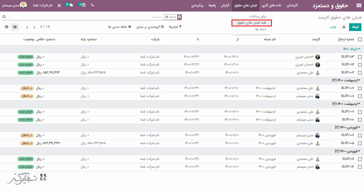 اکنون اگر به ماژول حقوق و دستمزد> فیش های حقوق> همه فیش های حقوق بروید، می توانید تمام فیش های حقوقی کارمندان را مشاهده نمایید: