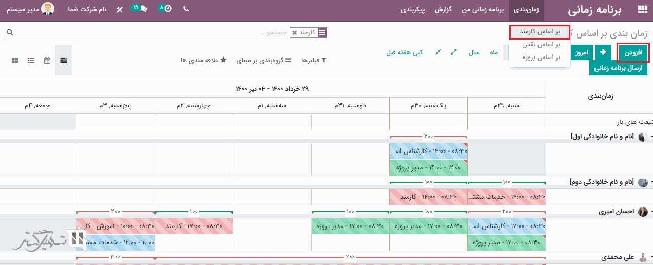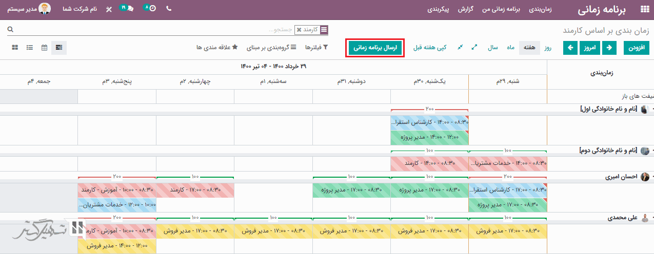 پس از ایجاد برنامه ها، می توان آنها را با کلیک بر روی "ارسال برنامه زمانی" موجود در ماژول برنامه زمانی برای کارمندان ارسال کرد.
