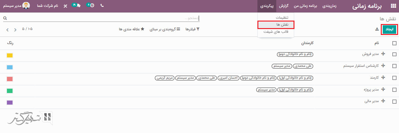 به ماژول برنامه زمانی> پیکربندی> نقش ها بروید و با کلیک بر روی دکمه "ایجاد" ، یک نقش جدید ایجاد کنید: