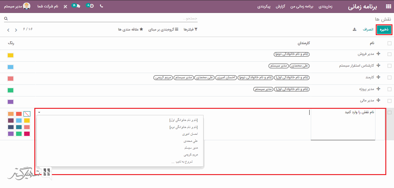 شما می توانید کارمندانی را که این نقش را در شرکت دارند تعیین کنید. علاوه بر این، برای شناسایی نقش ها می توان برخی از رنگ ها را تعیین کرد.