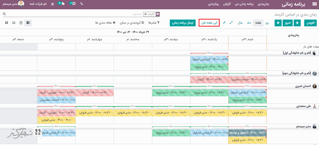 بله، با کلیک بر روی دکمه "کپی هفته قبل" ، می توانید برنامه زمانبندی شده هفته قبل را در هفته جاری کپی کنید: