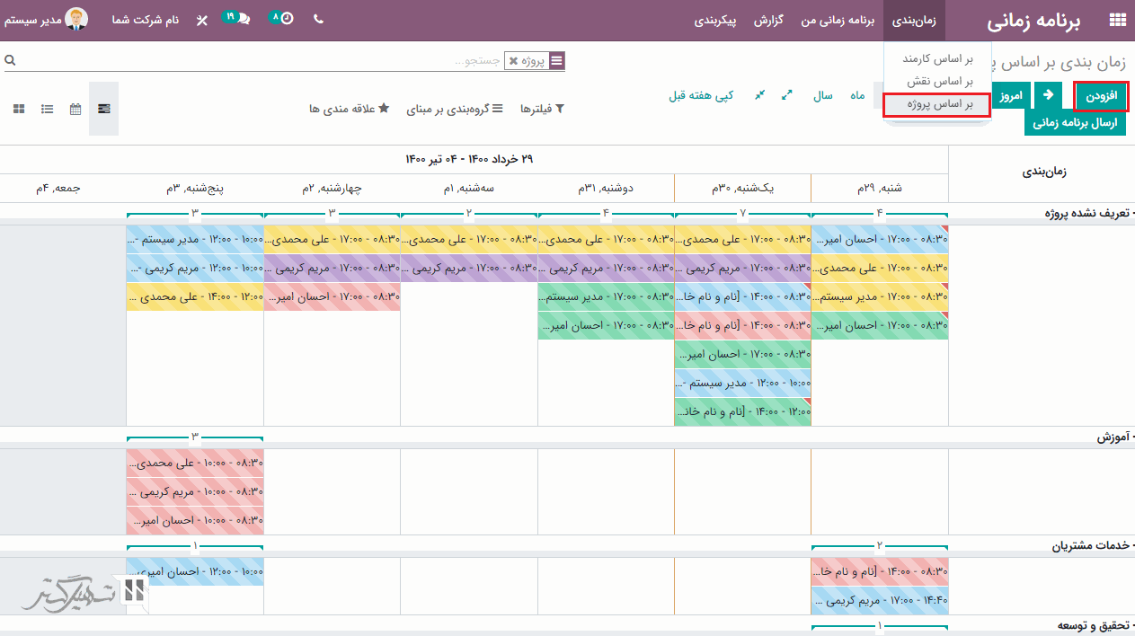 برای ایجاد زمانبندی بر اساس پروژه، به ماژول برنامه زمانی> زمانبندی> بر اساس پروژه بروید و بر روی دکمه "افزودن" کلیک کنید: