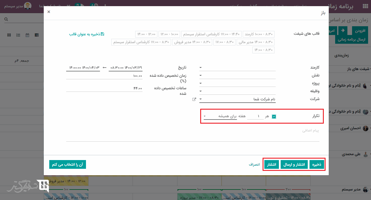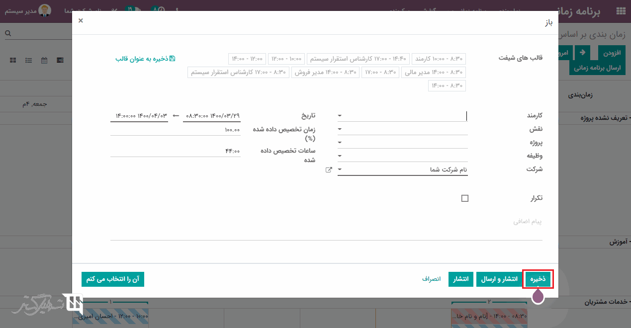 در ویزارد باز شده جزئیات کارمندی که می خواهید برا او زمانبندی ایجاد کنید و فیلدهای الزامی از جمله نقش، پروژه و وظیفه را اضافه نمایید، همچنین اگر می خواهید هر هفته یا برای همیشه نقش را تکرار کنید، گزینه "تکرار" را فعال کنیدو بر روی دکمه "ذخیره" کلیک نمایید: