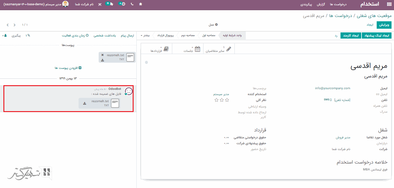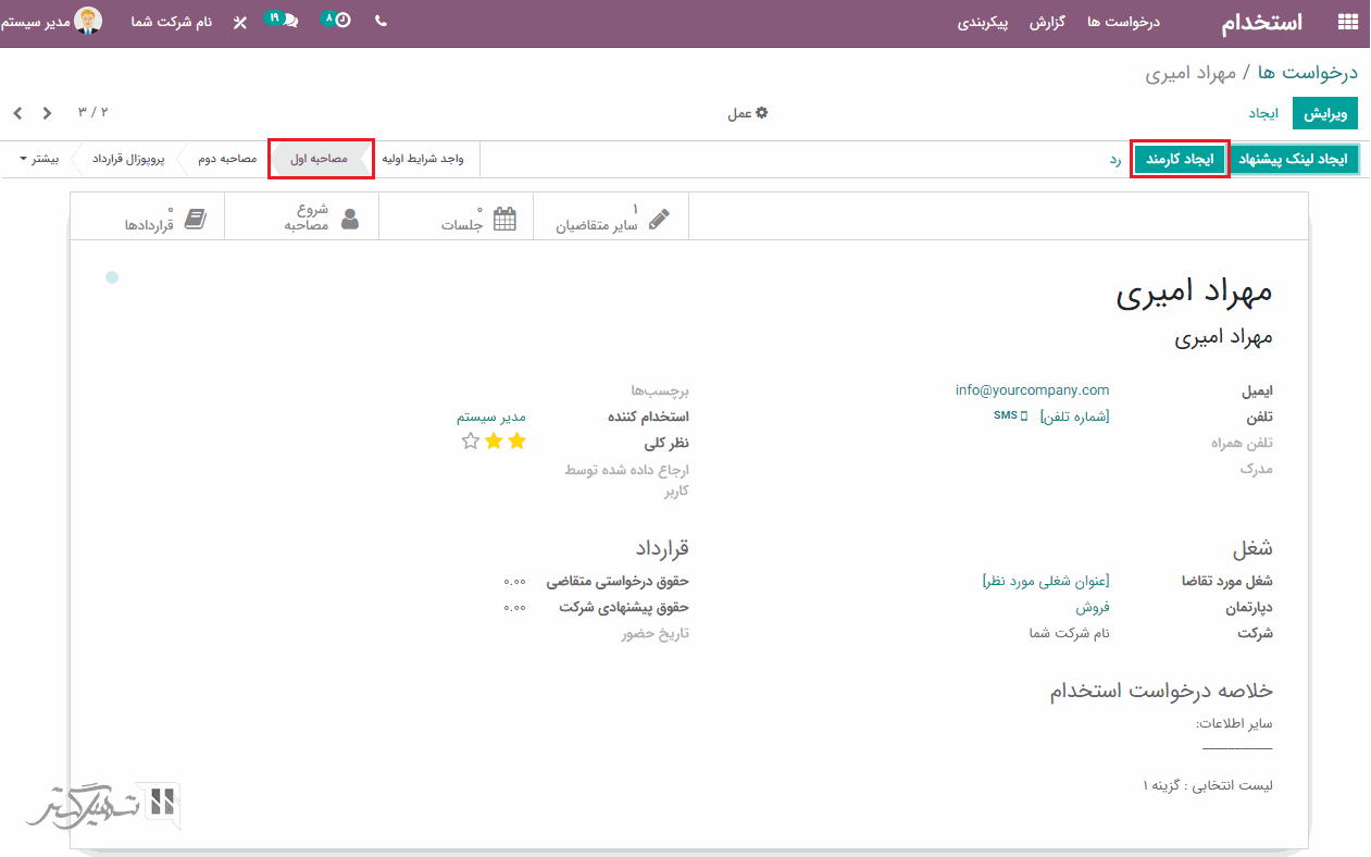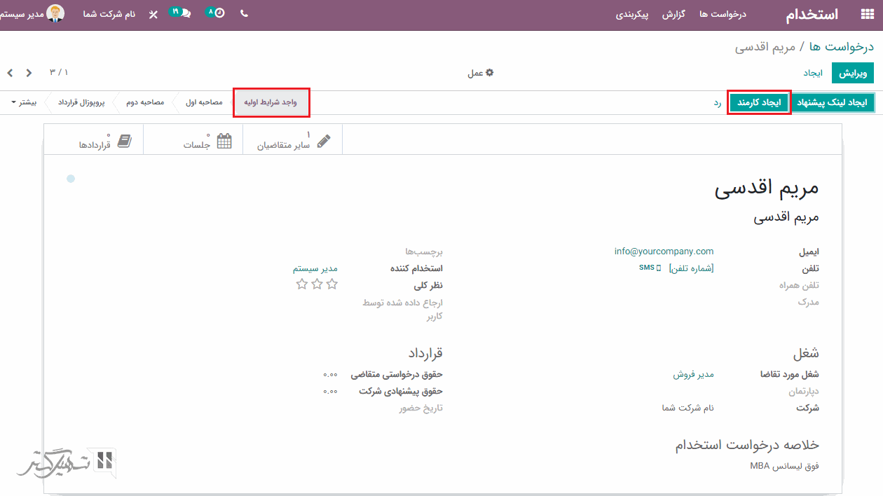 اگر بر روی آن کلیک نمایید، به صفحه قرارداد هدایت خواهید شد که در آن فیلدهای موقعیت شغلی و جزئیات شرکت به طور خودکار پر شده است، می توانید سایز جزئیات کارمند را اضافه کرده و بر روی دکمه "ذخیره" کلیک نمایید: