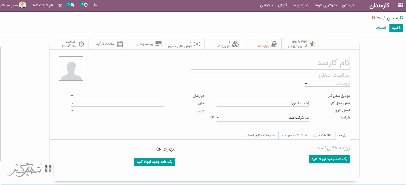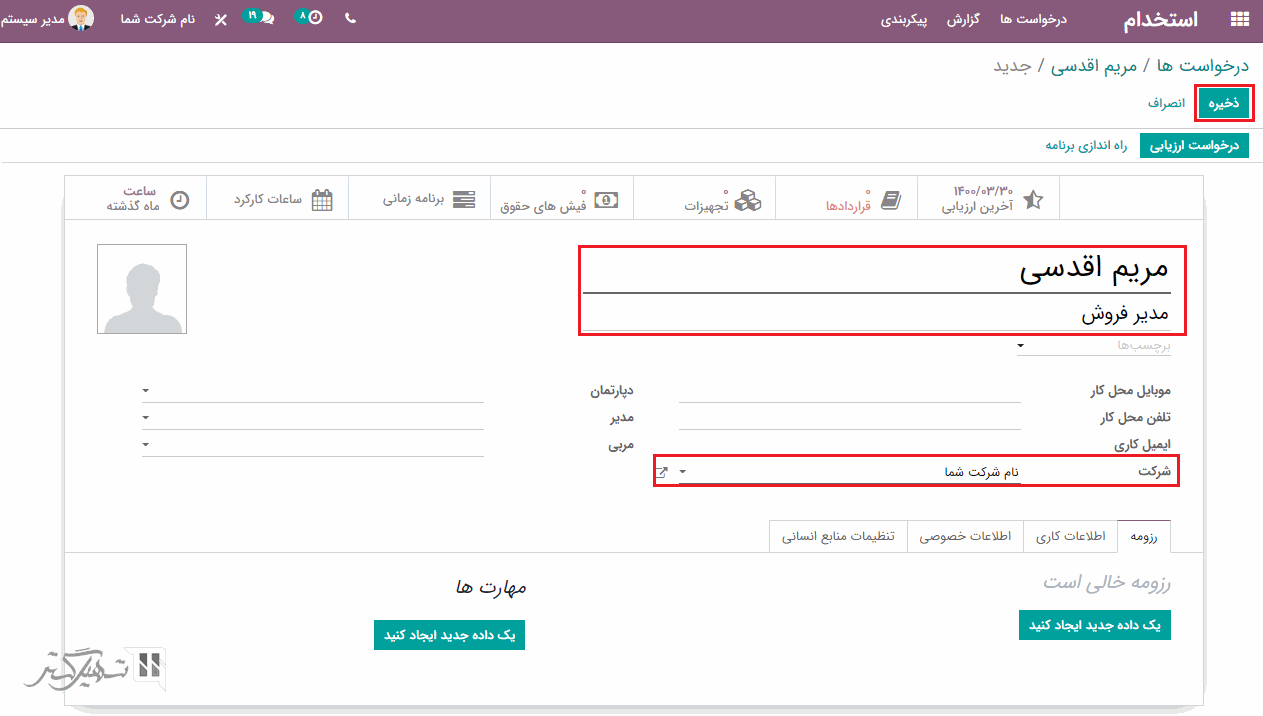 در فرم ایجاد جزئیات مربوط به نام، موقعیت شغلی، دپارتمان، مدیر، مربی، جزئیات رزومه، اطلاعات کاری، اطلاعات خصوصی و تنظیمات منابع انسانی را اضافه کرده و بر روی دکمه "ذخیره" کلیک کنید: