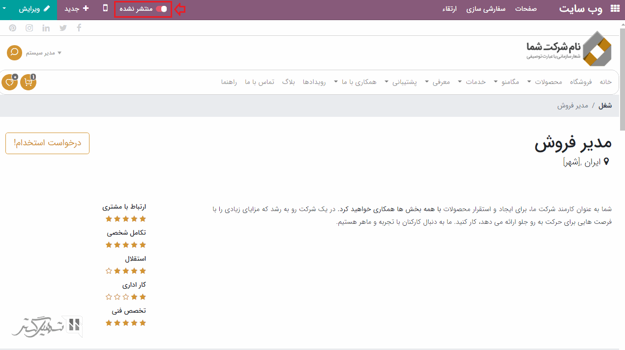 سپس در نمای وب سایت، بر روی " منتشر نشده" کلیک نمایید، اکنون موقعیت شغلی شما در سایت منتشر شده و قابل مشاهده عموم می باشد: