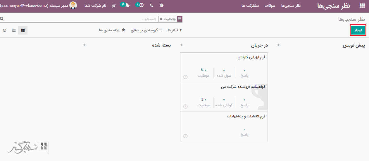 با استفاده از این ماژول می توانید فرم های مختلفی ایجاد نمایید. به ماژول نظرسنجی بروید و بر روی دکمه "ایجاد" کلیک کنید: