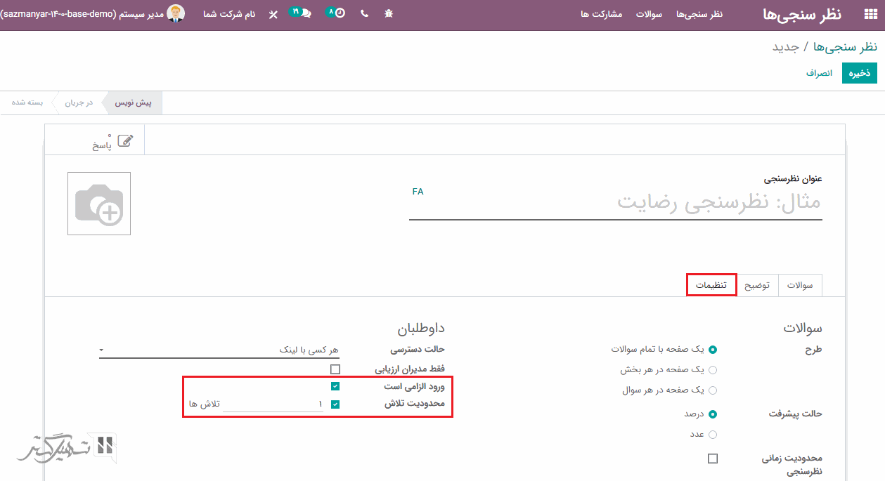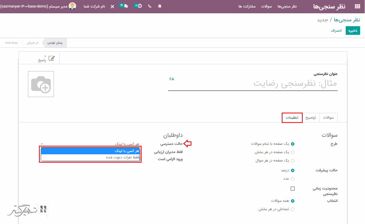 از طریق ماژول نظرسنجی> کلیک بر روی دکمه "ایجاد"> تب تنظیمات موجود در فرم نظرسنجی، حالت دسترسی داوطلبان را بر اساس هر کسی با لینک یا فقط نفرات دعوت شده انتخابی نمایید.