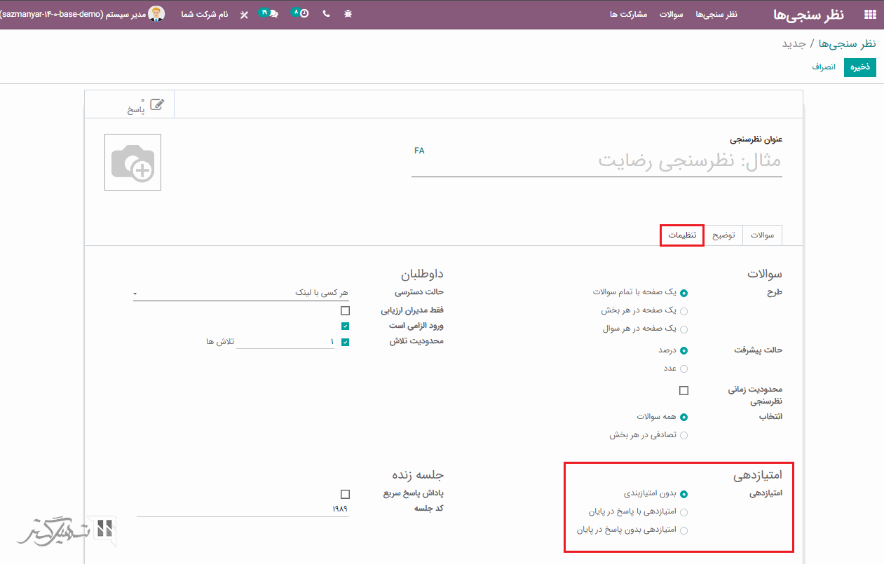 امتیازدهی را می توانید در تب تنظیمات فرم نظرسنجی بر اساس بدون امتیازبندی ، امتیازدهی با پاسخ در پایان (امتیاز و پاسخ ها در پایان آزمون نشان داده خواهد شد)، امتیازدهی بدون پاسخ در پایان (امتیاز فقط در پایان مصاحبه / آزمون نشان داده می شود)، تنظیم نمایید:
