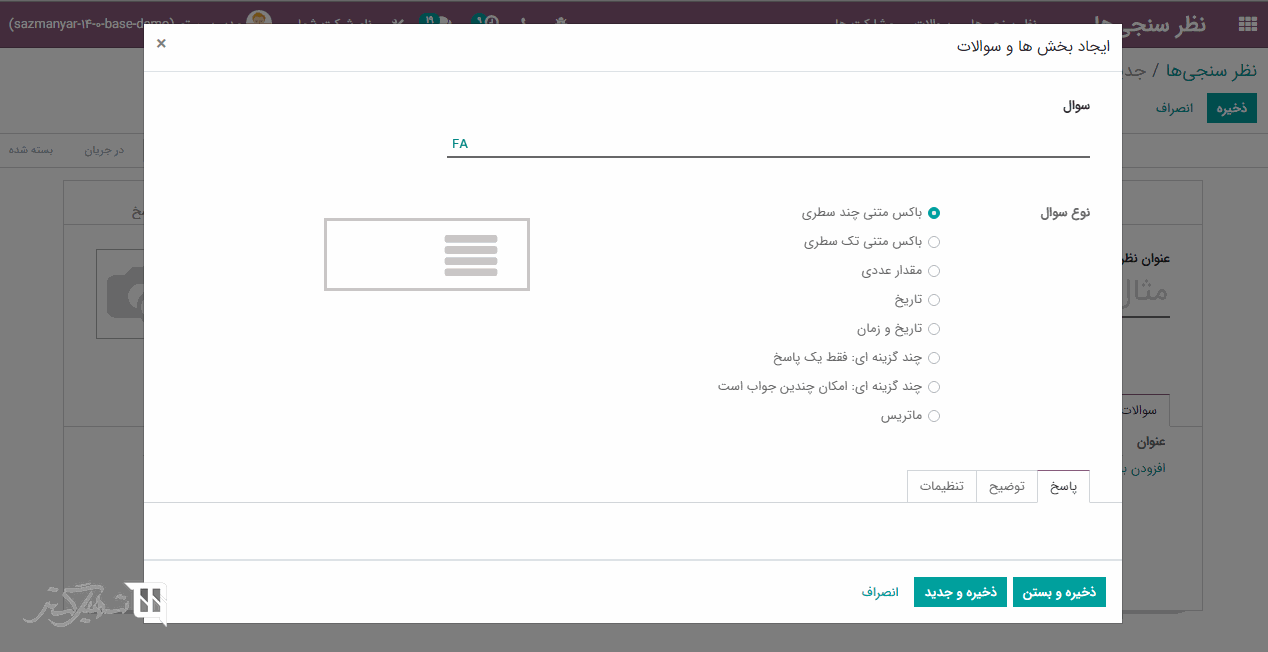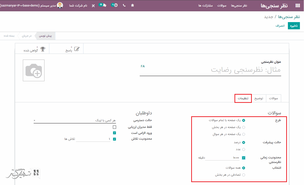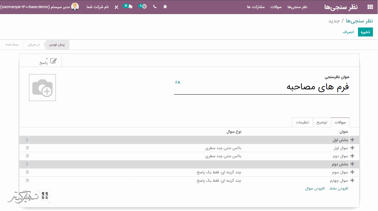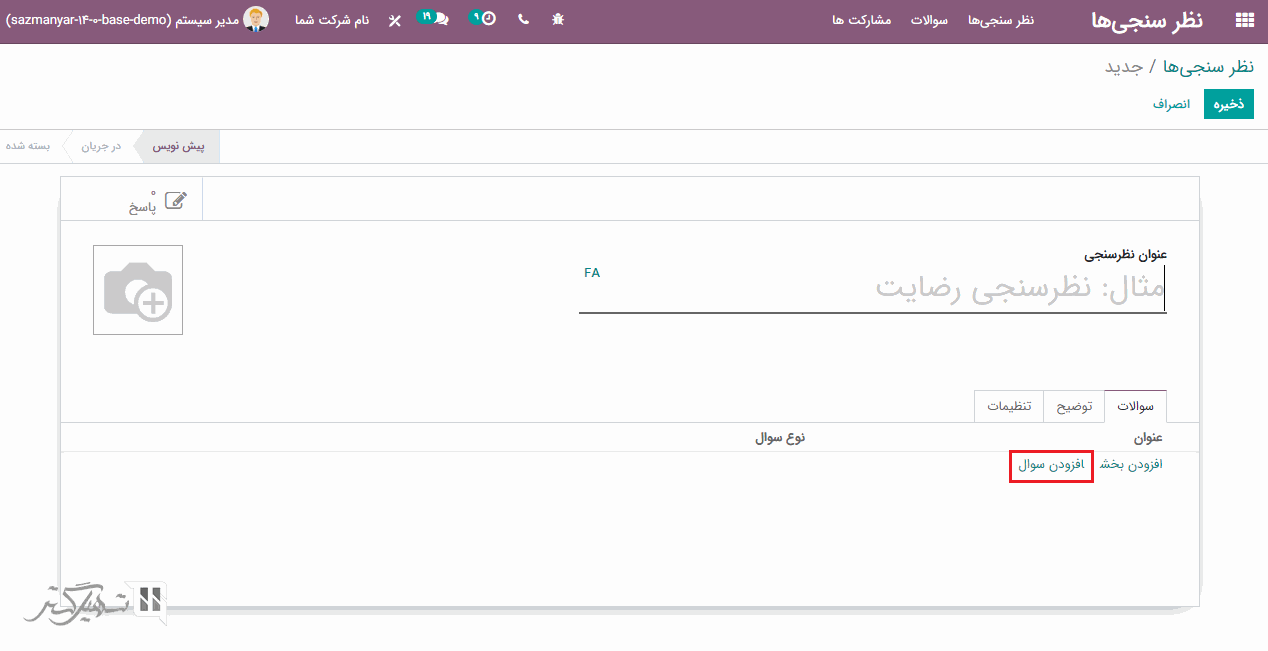 عنوان نظرسنجی را اضافه کرده سپس سوالات مصاحبه را در تب