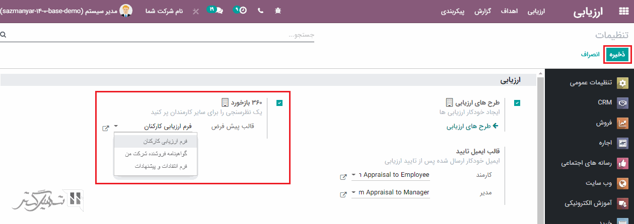 از طریق ماژول ارزیابی> پیکربندی> تنظیمات ، ویژگی "360 بازخورد" (از شما می خواهد نظرسنجی را برای سایر کارمندان پر کنید.) را فعال کرده و بر روی دکمه "ذخیره" کلیک کنید: