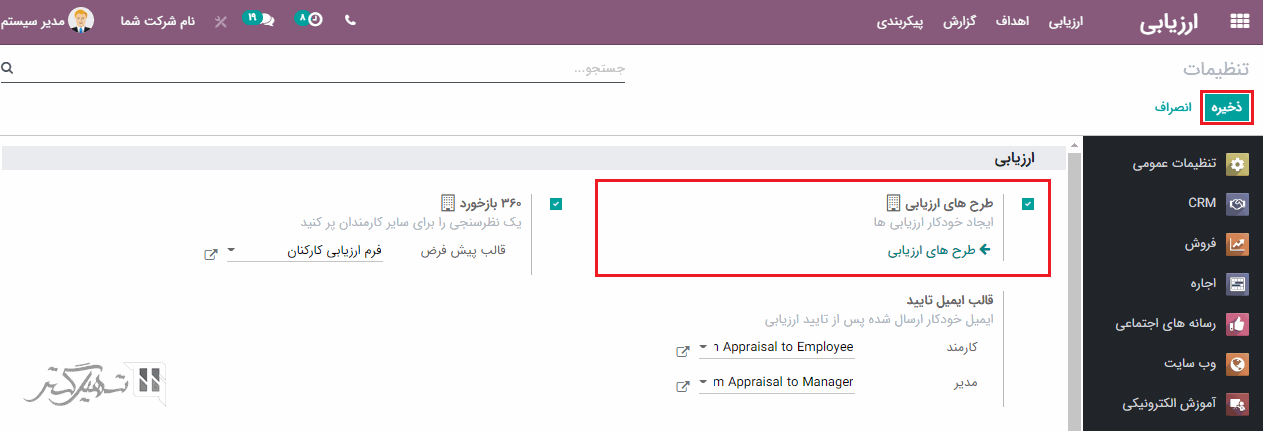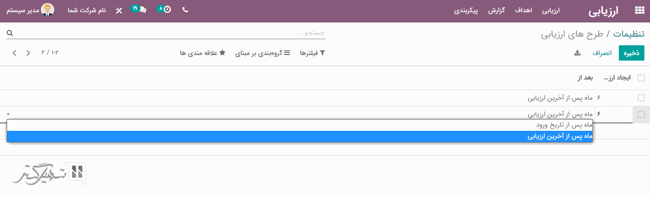 برای ایجاد خودکار ارزیابی ها، ابتدا از طریق ماژول ارزیابی> پیکربندی> تنظیمات> تب ارزیابی ، ویژگی "طرح های ارزیابی" را فعال کرده، سپس بر روی دکمه "ذخیره" کلیک کنید. طرح ارزیابی تعریف می کند که آیا ارزیابی پس از 6 ماه پس از تاریخ ورود لازم است یا 6 ماه پس از آخرین ارزیابی.
