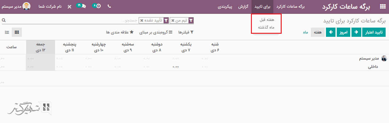 مدیر می تواند به برگه های ساعات کارکرد کاربر از طریق زیر منوی "برای تایید" دسترسی داشته باشد. او می تواند برگه ساعات کارکرد هفته قبل یا ماه گذشته را با کلیک بر روی دکمه "تایید اعتبار" تأیید کند.