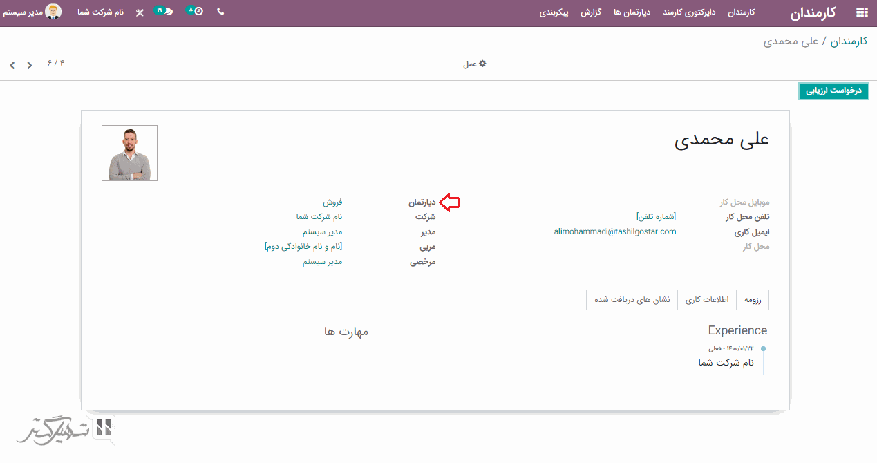 هنگام نصب ماژول "مدیریت مهارت ها" از طریق برنامه های اودوو، یک تب جدید "رزومه" برای اضافه کردن جزئیات کارمند اعم از مهارت های کارکنان، تجربه، تحصیلات و غیر ظاهر خواهد شد.