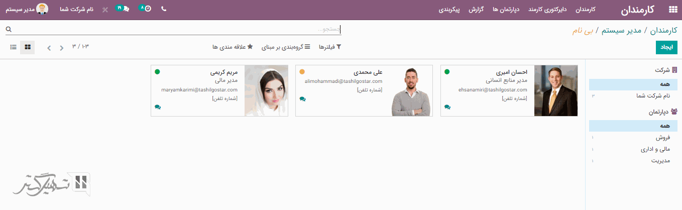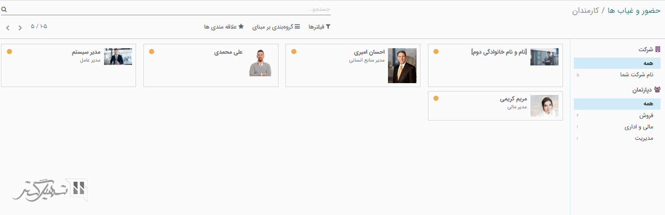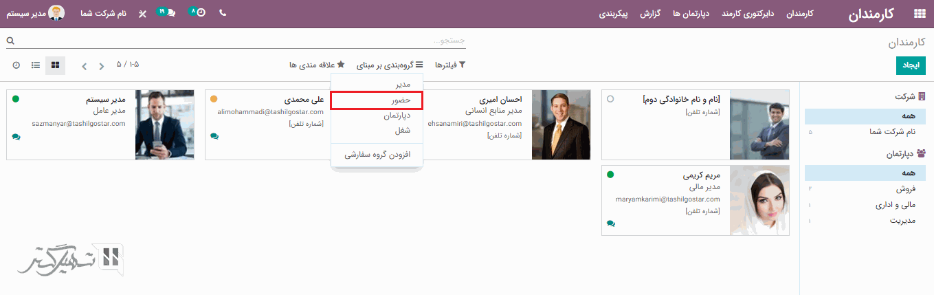 می توان کارمندان را براساس شرکتشان با کلیک بر روی گزینه "گروهبندی بر مبنای" فیلتر کرد. این شرکت ها در سمت راست صفحه نمایش داده می شوند. بر روی هر شرکتی کلیک کنید، کارمندان مربوط به آن شرکت نمایش داده خواهد شد: