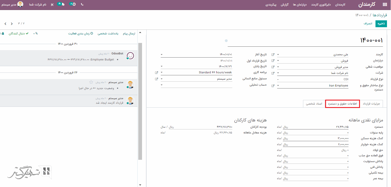 اطلاعات حقوق و دستمزد کارمندان را می توانید از طریق ماژول کارمندان> کارمندان> قراردادها پیکربندی کنید و جزئیات حقوق و و دستمزد را در فیلدهای مربوطه اضافه نمایید: