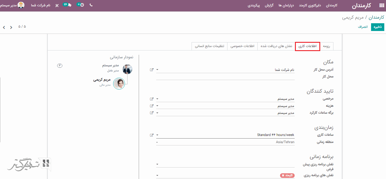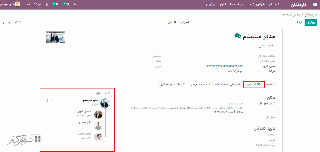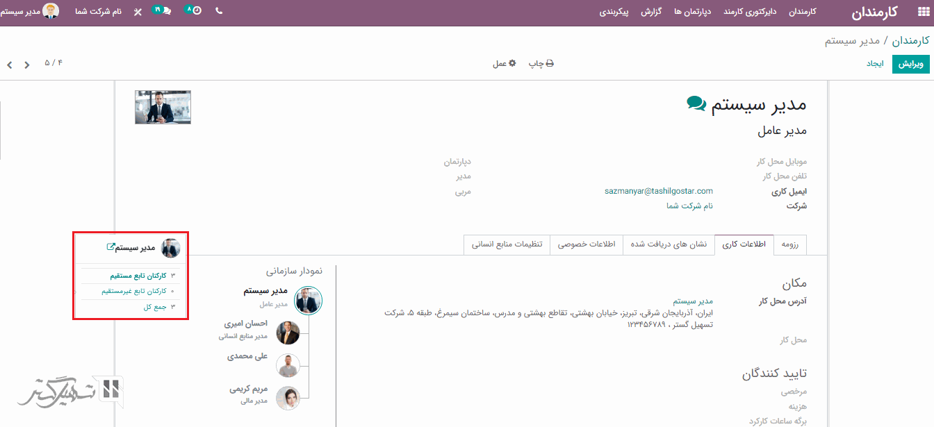 هنگام تنظیم کردن مدیر برای یک کارمند، نمودار سازمانی در تب اطلاعات کاری فرم کارمند و مدیر به روز می شود. علاوه بر این، در نمودار سازمانی تعداد کارکنان تابع مستقیم و کارکنان تابع غیرمستقیم نیز نشان داده خواهد شد: