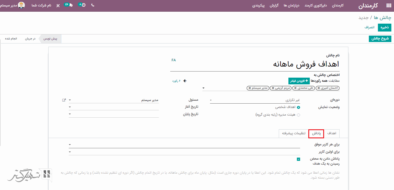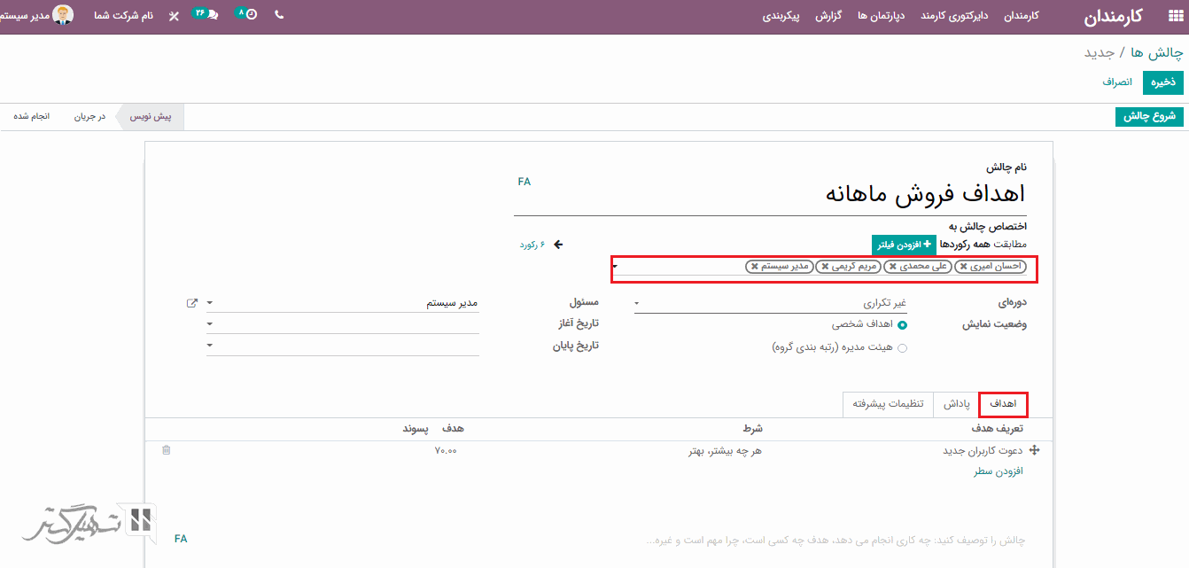 در فرم ایجاد می توانید کارمندانی که می خواهید در این چالش مشارکت داشته باشند، اضافه نمایید. علاوه بر این در تب اهداف، تعریف هدف، شرط و هدف را تعیین کنید: