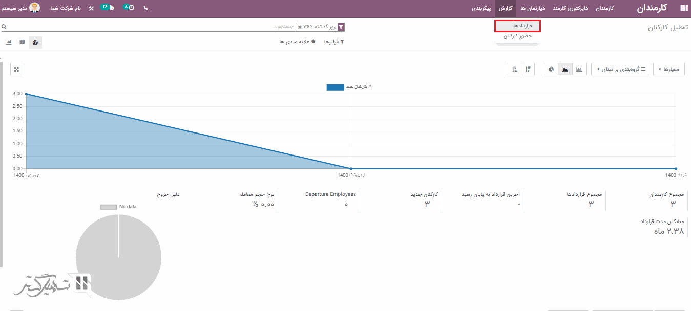 به ماژول کارمندان> گزارش> قراردادها بروید: