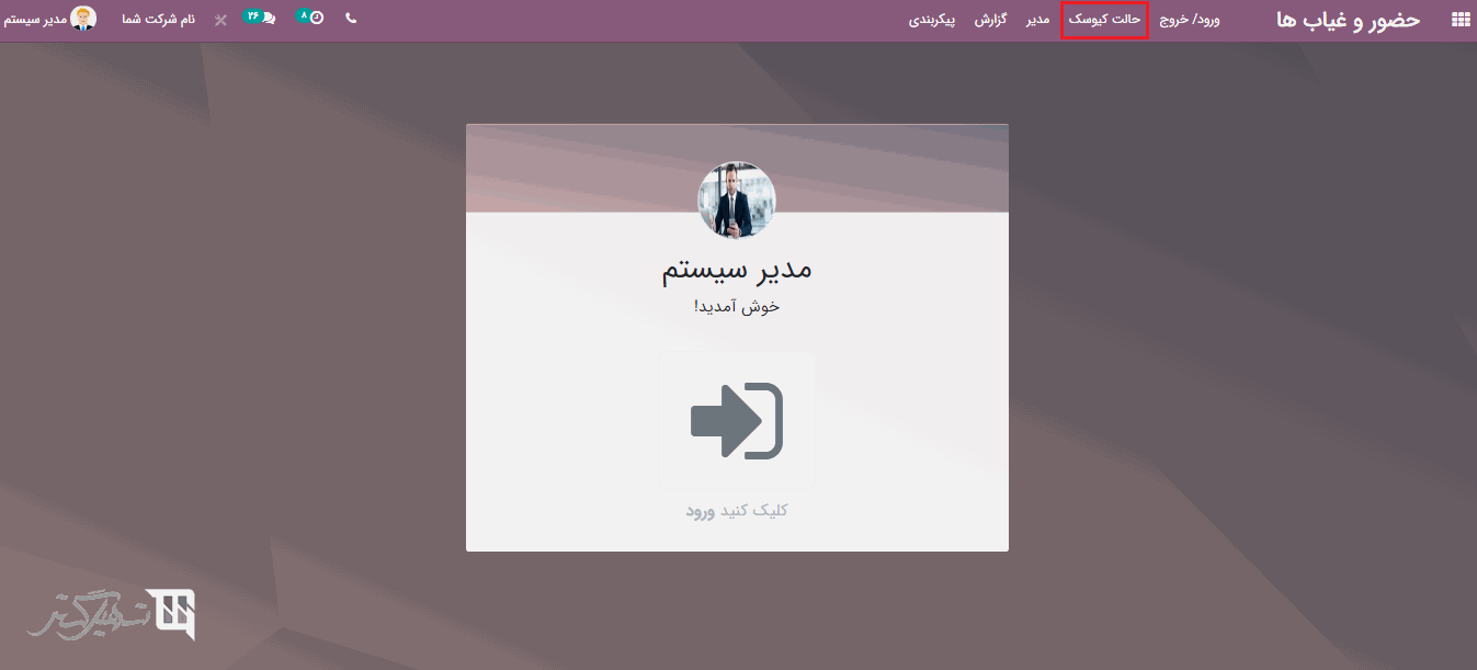 از طریق ماژول حضور و غیاب ها> حالت کیوسک می توانید نشان کارمند را اسکن کنید: