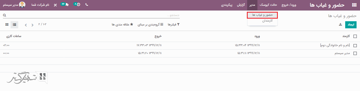 کارمندان می توانندبا وارد کردن شماره پین یا با اسکن نشان خود، حضور خود را ثبت کنند. به ماژول حضور و غیاب> مدیر بروید، در آنجا می توانید ورود و خروج کارمندان خود را مشاهده نمایید: