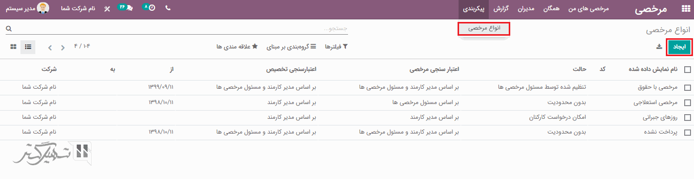 هنگام ایجاد نوع مرخصی از طریق ماژول مرخصی> پیکربندی> انواع مرخصی> کلیک بر روی دکمه "ایجاد"، می توانید نوع تایید را در فرم ایجاد مشخص نمایید. تایید می تواند بر اساس بدون تایید، بر اساس مسئول مرخصی ها، بر اساس مدیر کارمند، بر اساس مدیر کارمند و مسئول مرخصی ها انتخاب شود.