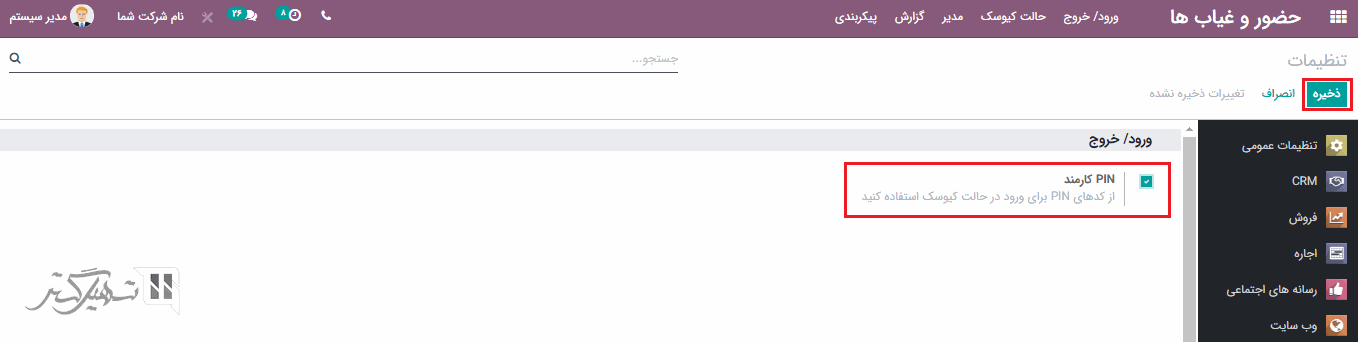 بله ، ابتدا "PIN کارمند" را از طریق ماژول حضور و غیاب> پیکربندی> تنظیمات فعال کرده و بر روی دکمه "ذخیره" کلیک کنید: