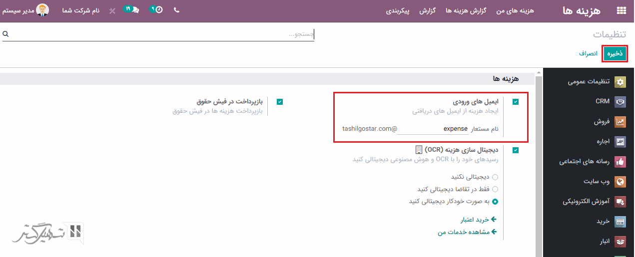برای ایجاد هزینه از طریق ایمیل های ورودی باید ویژگی ایمیل های ورودی را از طریق ماژول هزینه ها> پیکربندی> تنظیمات> تب هزینه ها ، فعال کرده و نام مستعار را در فیلد مربوطه اضافه کنید، سپس بر روی دکمه "ذخیره" کلیک نمایید: