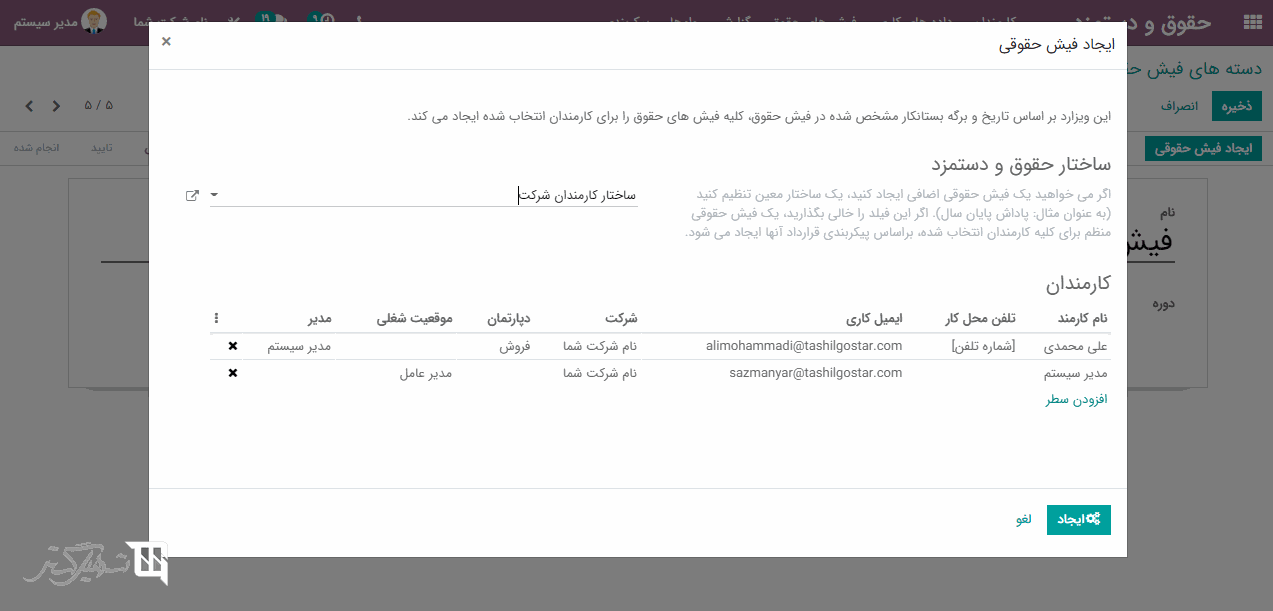 اکنون کلیه کارمندانی که به این شرکت تعلق دارند، در لیست اضافه خواهند شد. در صورت نیاز می توانید کارمندان را از حالت انتخاب خارج کنید و ساختار حقوق و دستمزد آنها را انتخاب کرده و بر روی دکمه " ایجاد" کلیک کنید. در نهایت، با طی این فرآیند، برای همه کارمندان انتخاب شده فیش حقوقی ایجاد خواهد شد.