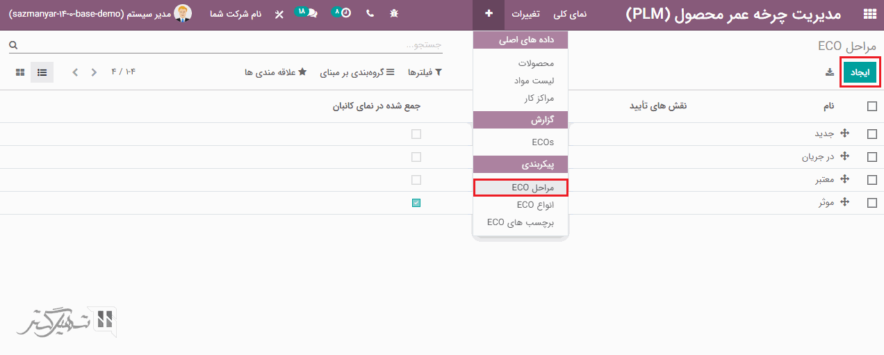 برای هر مرحله از ECO می توان تاییدها را اعمال کرد. به ماژول مدیریت چرخه عمر محصول (PLM)> پیکربندی> مراحل ECO بروید و بر روی دکمه "ایجاد" کلیک کند.