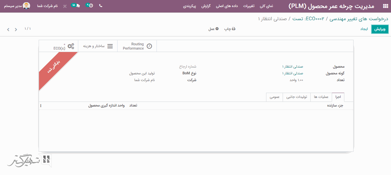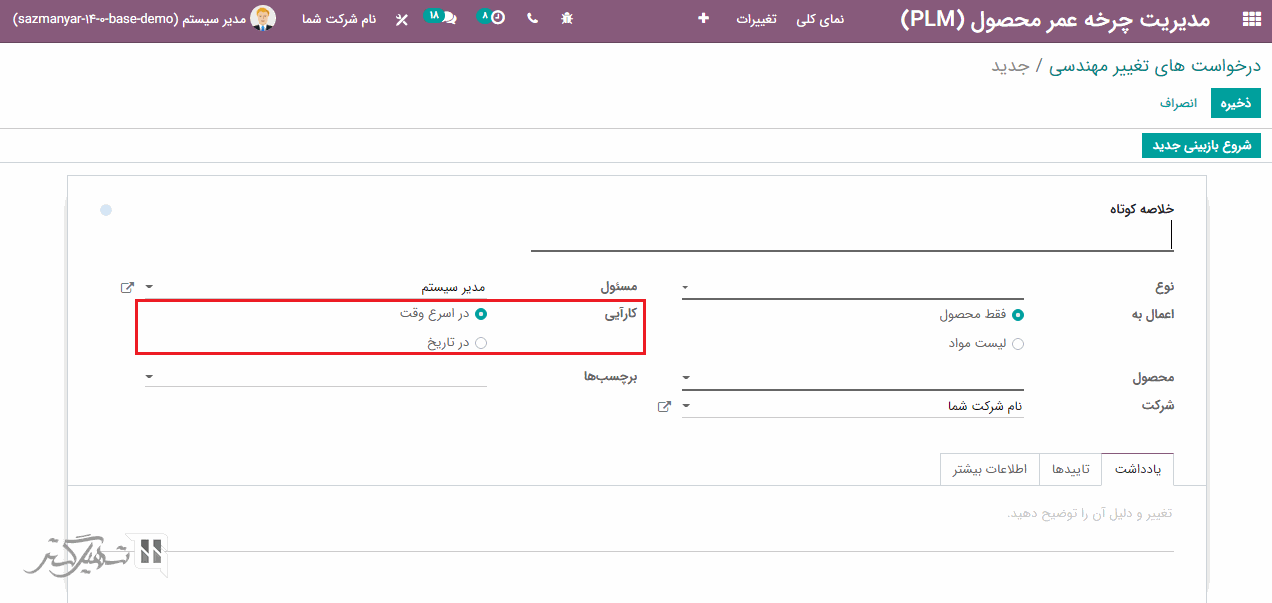 در فرم ایجاد، می توانید نام و نوع ECO را انتخاب نمایید و فیلدهای اعمال به (فقط محصول / لیست مواد)، محصول، مسئول، کارآیی را تنظیم کنید.