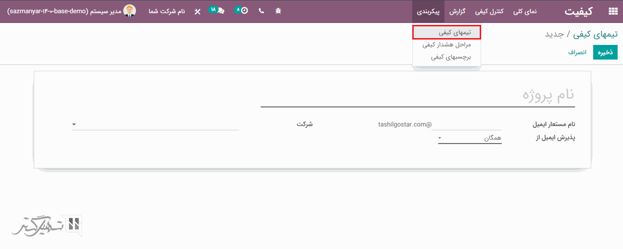 تیم های کیفی را می توان از طریق ماژول کیفیت> پیکربندی> تیمهای کیفی ایجاد کرد. در فرم ایجاد نام پروژه، نام مستعار ایمیل و شرکت را اضافه نمایید. همچنین می توانید در فیلد "پذیرش ایمیل از" تنظیم کنید که از چه کسانی ایمیل پذیرفته شود.
