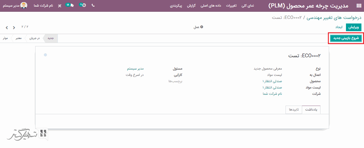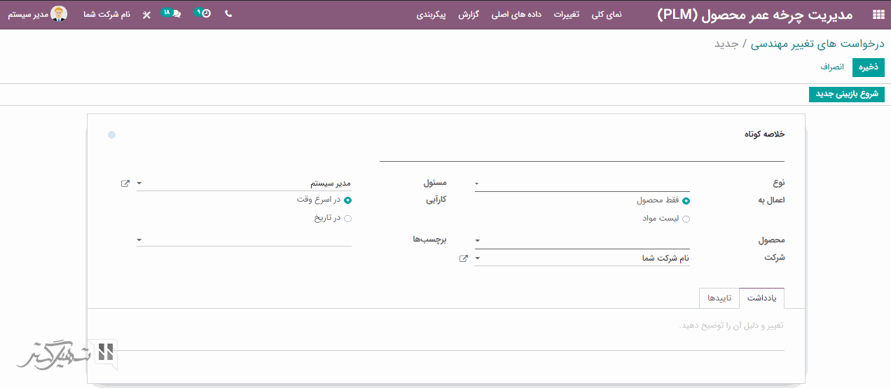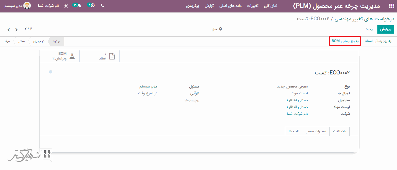 افزونه مدیریت چرخه عمر محصول (PLM) به تغییرات مهندسی در عملیات کمک می کند. به ماژول PLM> تغییرات بروید و بر روی دکمه "ایجاد" کلیک کنید.