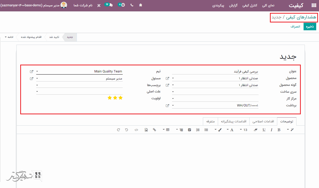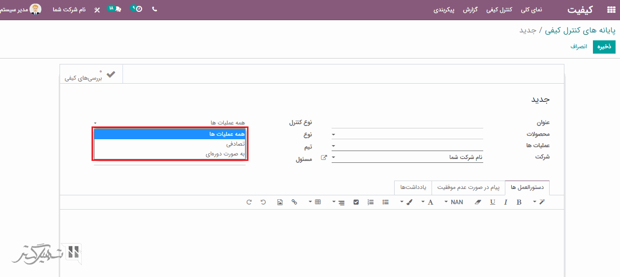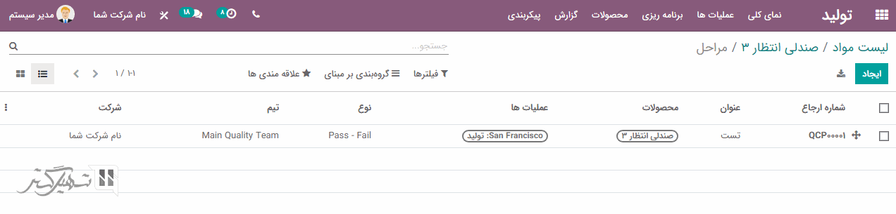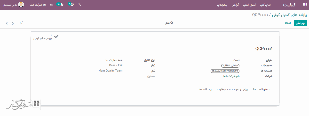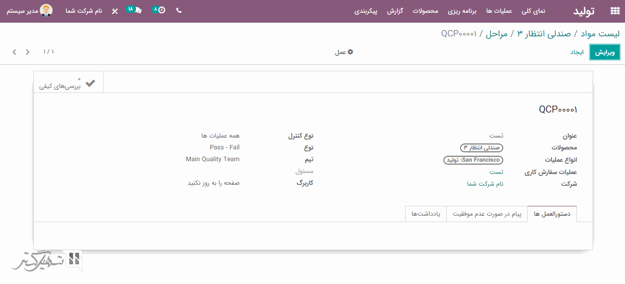 فرض کنید با اضافه کردن عنوان، محصولات، نوع کنترل، نوع و عملیاتی که به عنوان رسید انتخاب می شود، یک پایانه کنترل کیفی برای رسیدها تنظیم شده است.