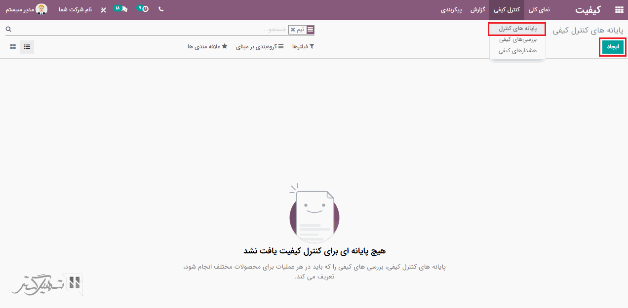 بله، ابتدا ما باید یک پایانه کنترل کیفیت از طریق ماژول کیفیت ایجاد کنیم. به ماژول کیفیت> کنترل کیفی> پایانه های کنترل بروید و بر روی دکمه "ایجاد" کلیک کنید. و یک پایانه کنترل برای رسیدها یا سفارشات تحویل ایجاد کنید.