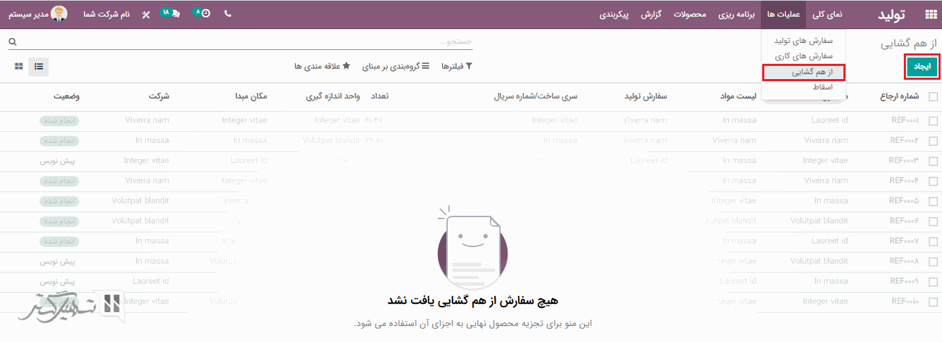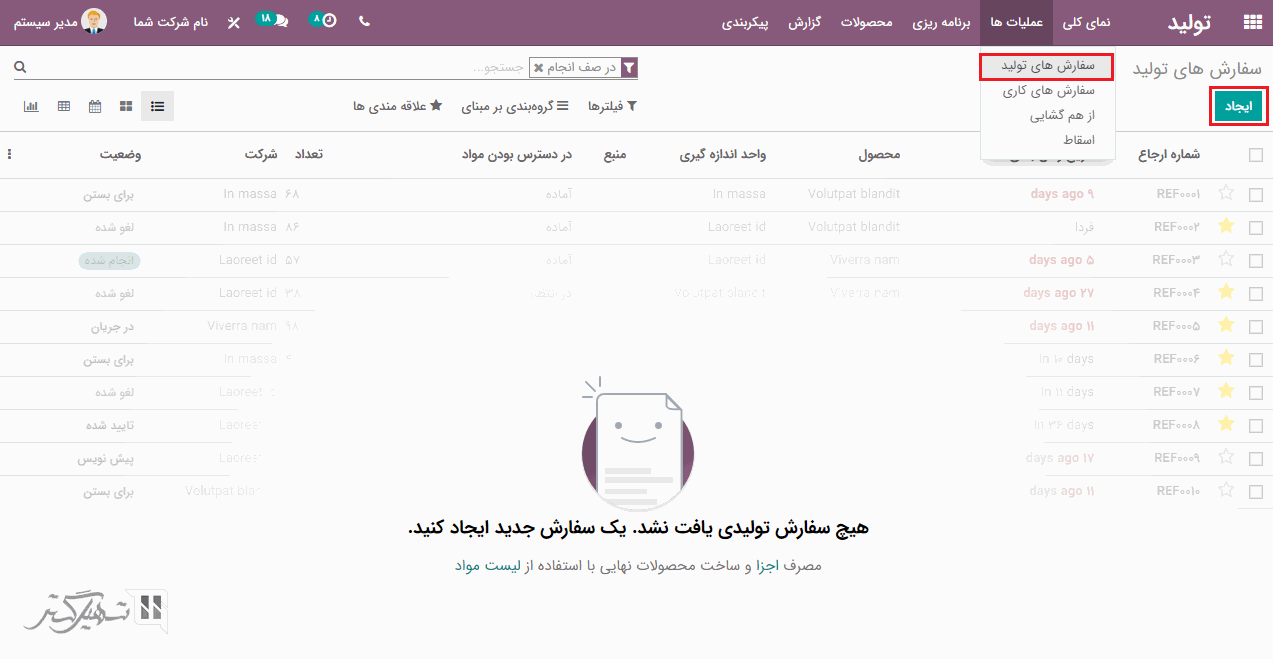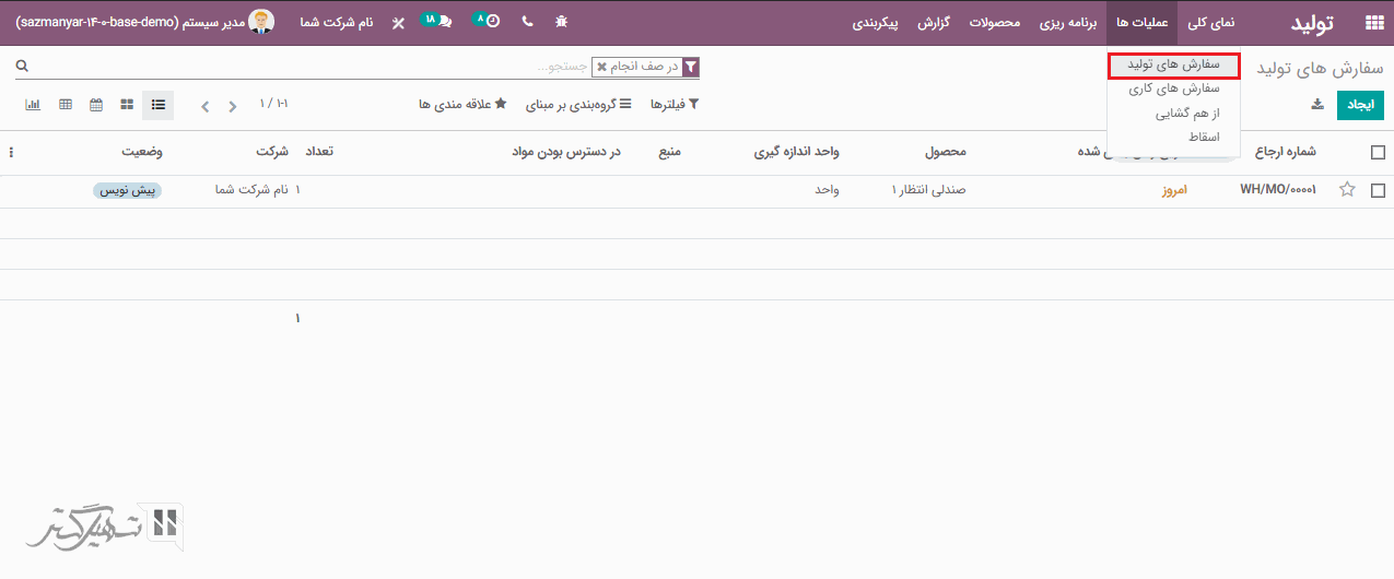 از طریق ماژول تولید> عملیات ها > سفارش های تولید ، کلیه سفارش های تولید را می توانید مشاهده کنید.