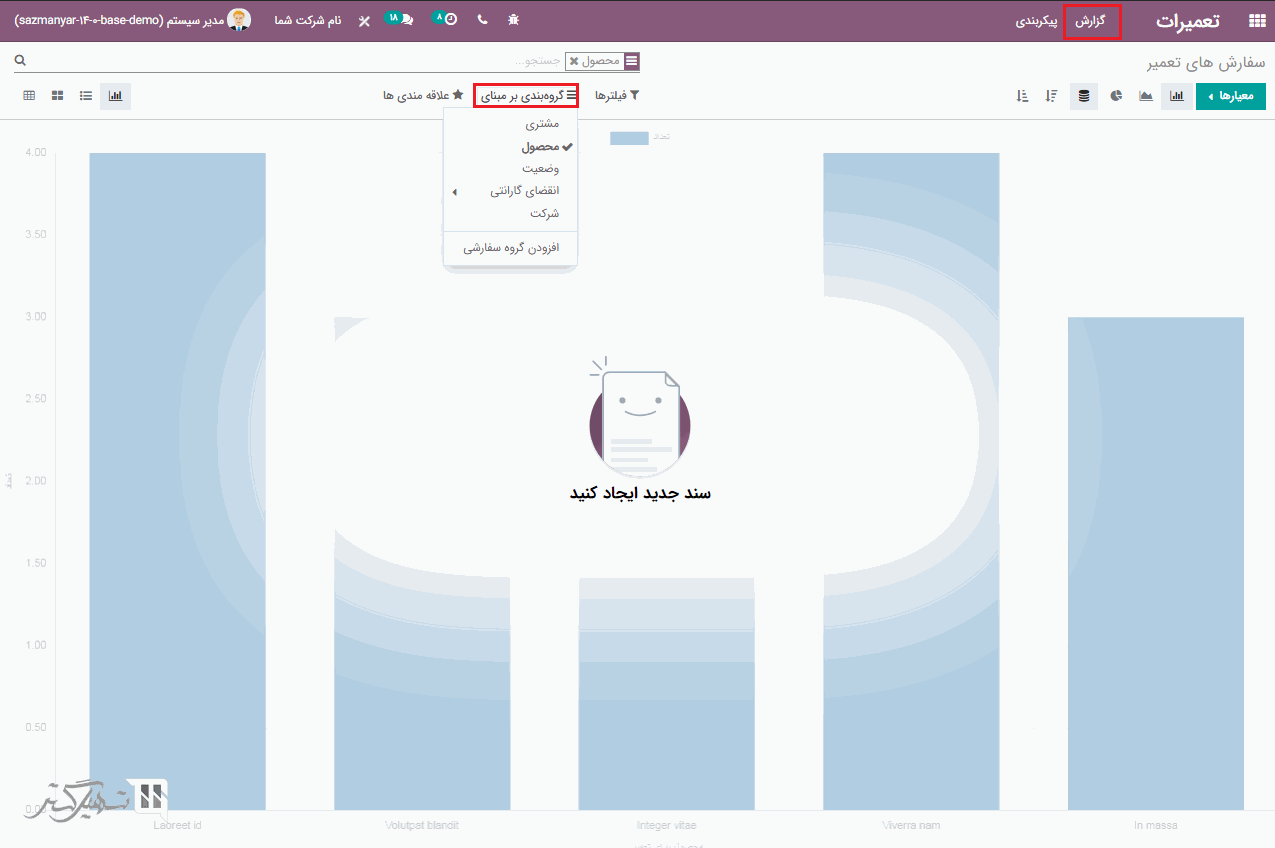 تجزیه و تحلیل سفارش تعمیر را می توان از طریق ماژول تعمیرات> گزارش مشاهده کرد. شما می توانید تعمیرات را بر اساس انقضا گارانتی، سفارشات تعمیر، وضعیت، مشتری، محصول، فاکتور ، آماده تعمیر و غیره تجزیه و تحلیل کنید.
