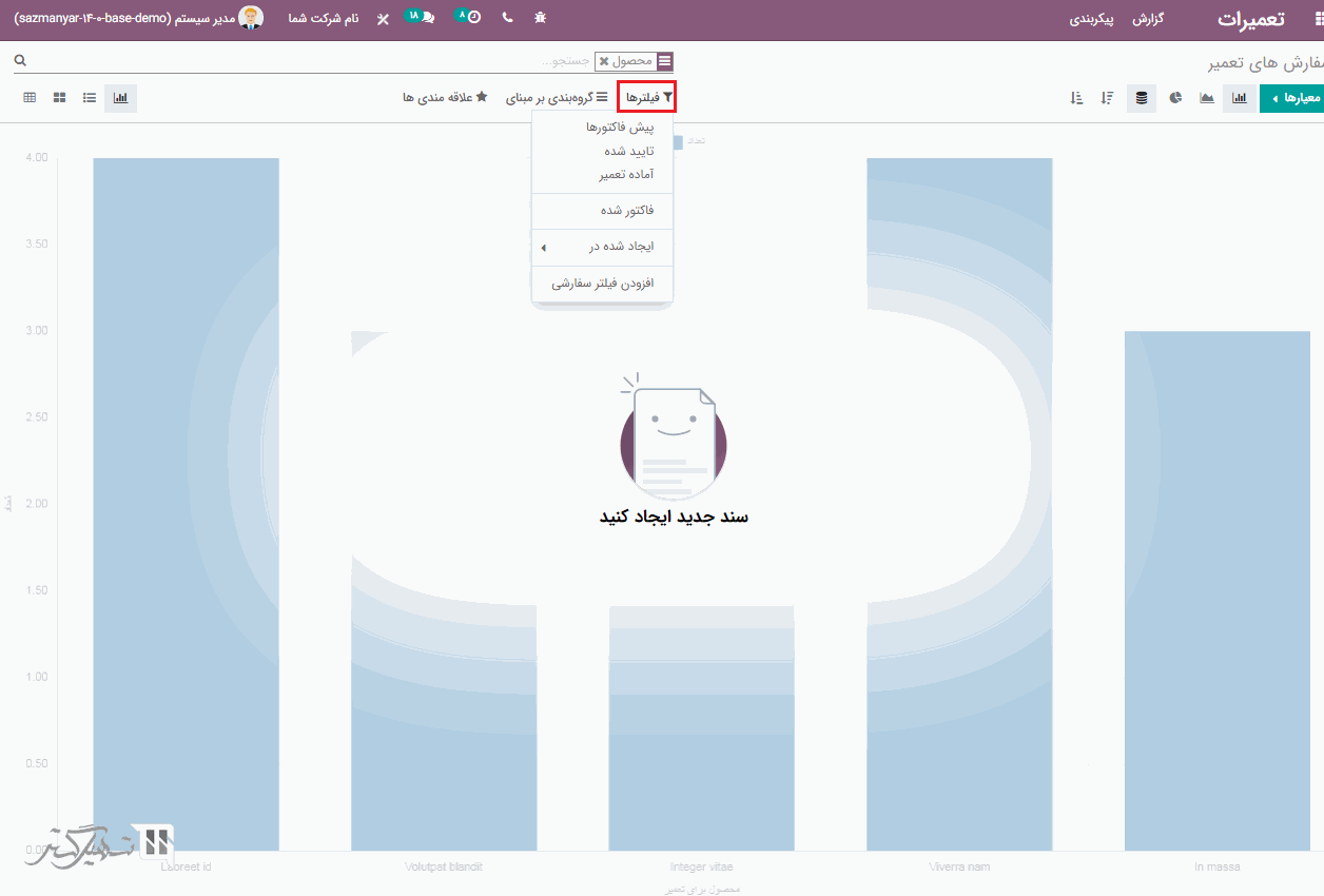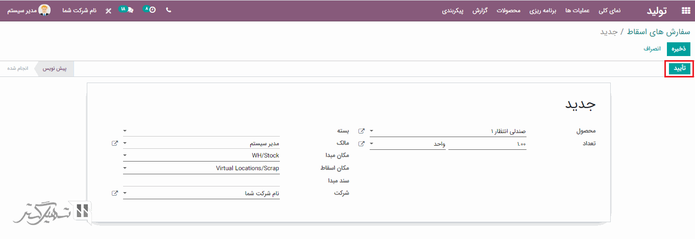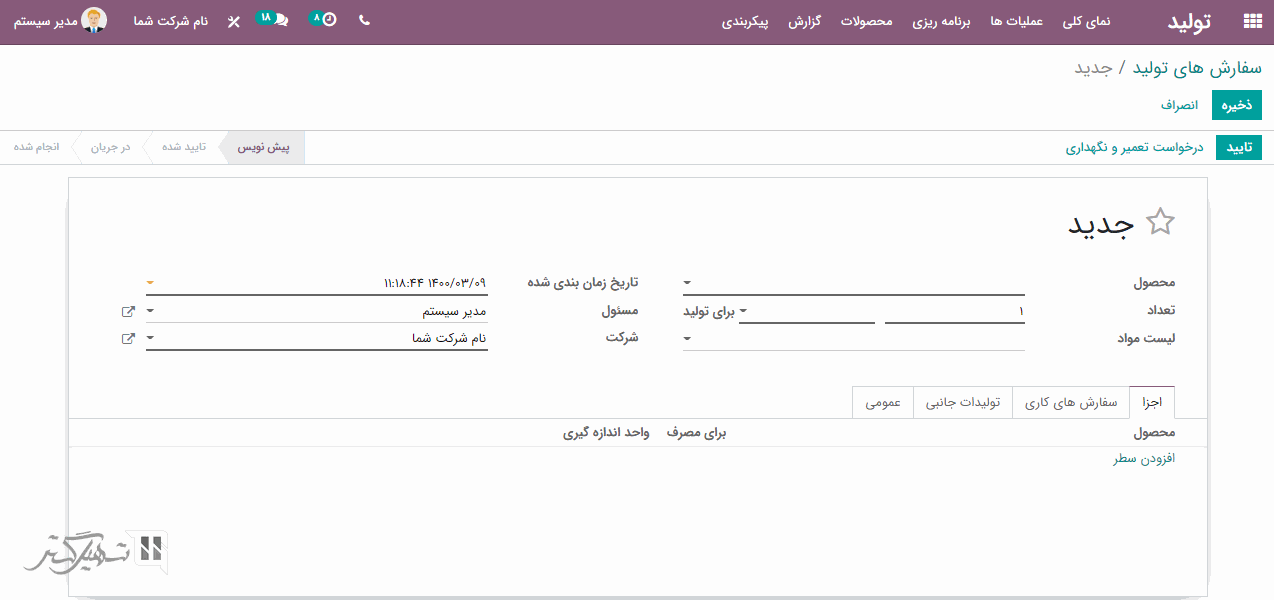 سفارش های تولید را می توانید از طریق ماژول تولید> عملیات ها> سفارش های تولید> کلیک بر روی دکمه "ایجاد" ، ایجاد کنید.