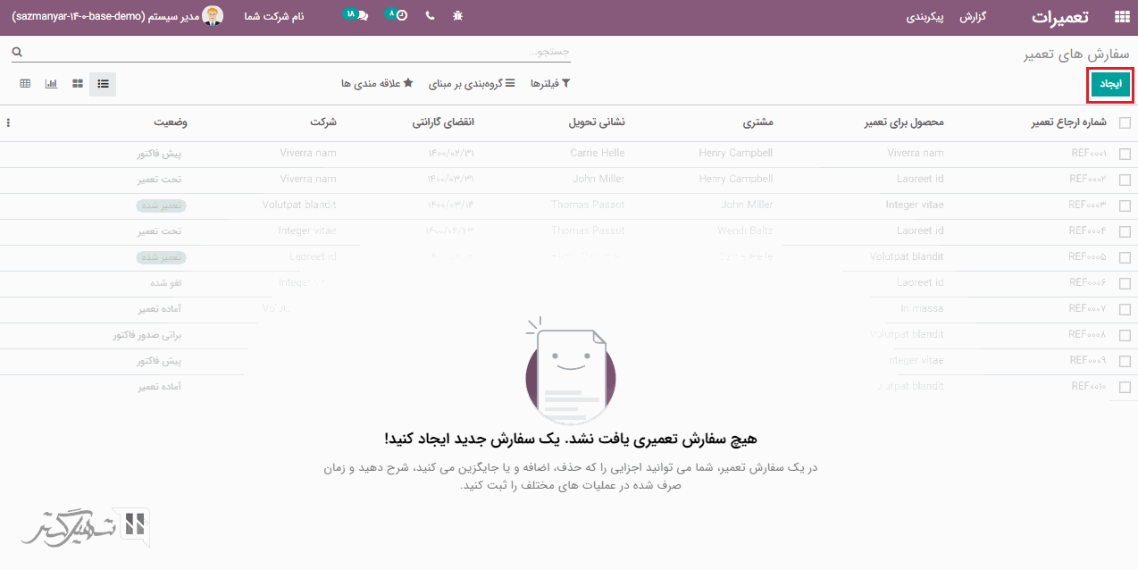 گردش کار از ایجاد درخواست تعمیر شروع می شود. در اینجا، بر روی دکمه "ایجاد" کلیک کنید و در فرم سفارش تعمیر، فیلدهای محصول برای تعمیر، تعداد محصول، مشتری، مسئول، انقضای گارانتی، روش فاکتور و غیره اضافه کنید: