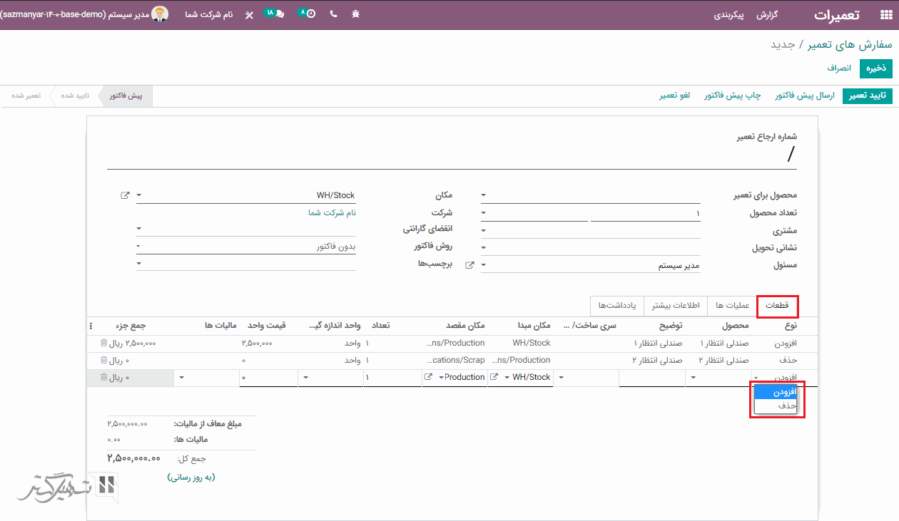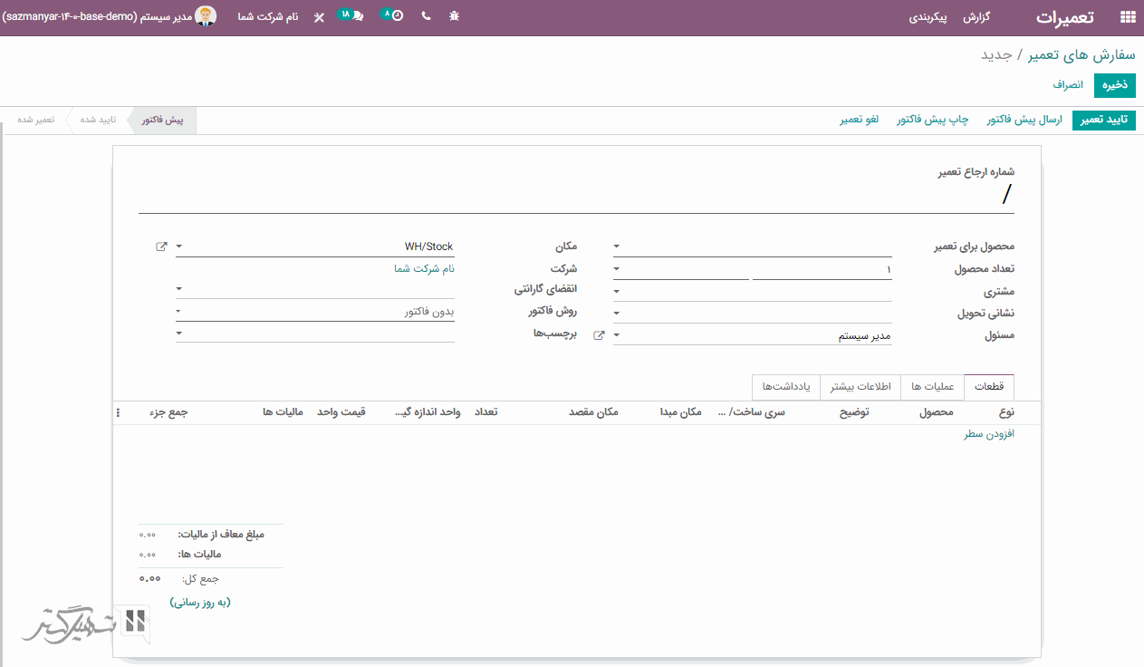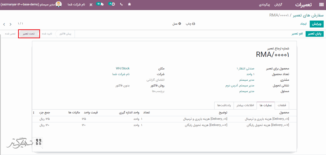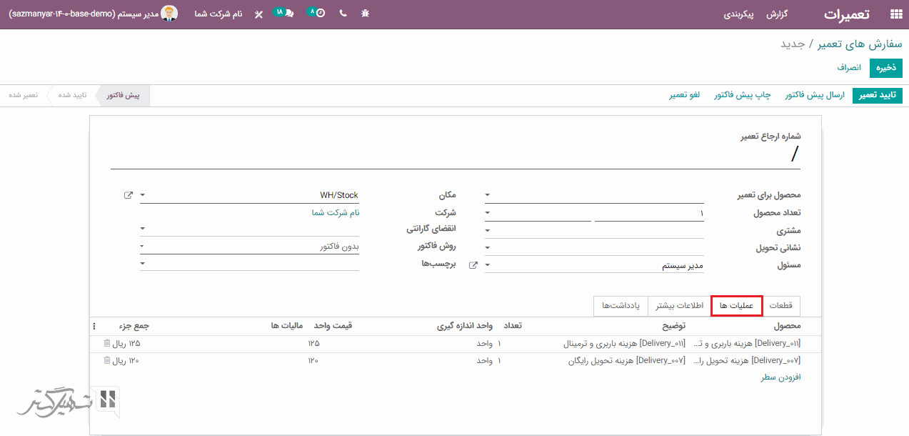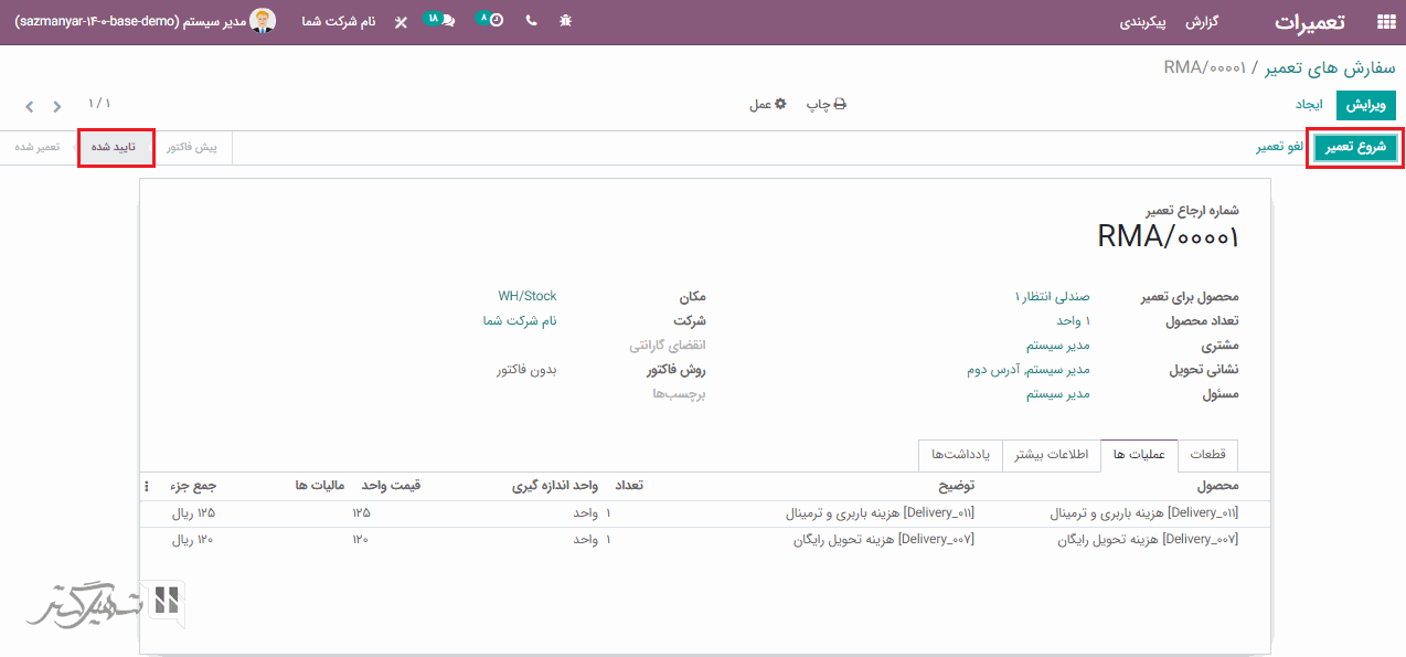 در قیمت گذاری، مبلغ مربوط به قطعات و عملیات کسر می شود. اکنون اگر درخواست تعمیر را تأیید کنید، وضعیت از پیش فاکتور به تأیید شده تغییر می یابد.