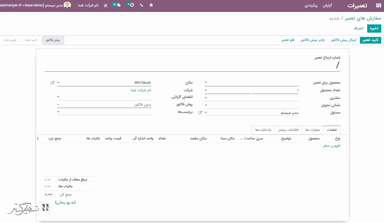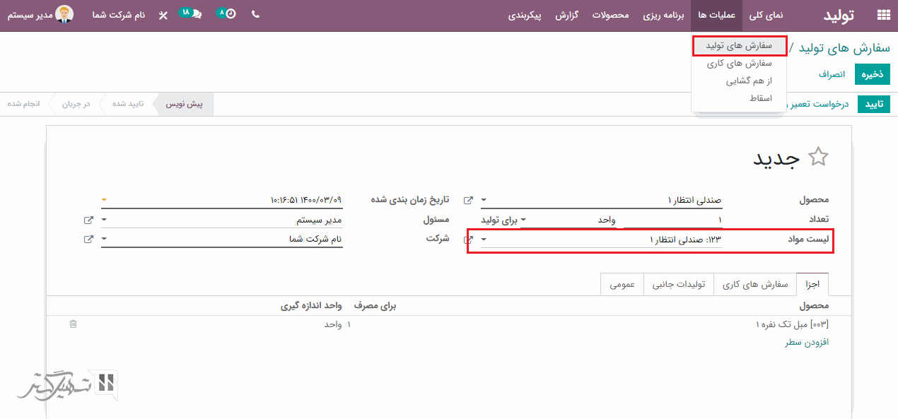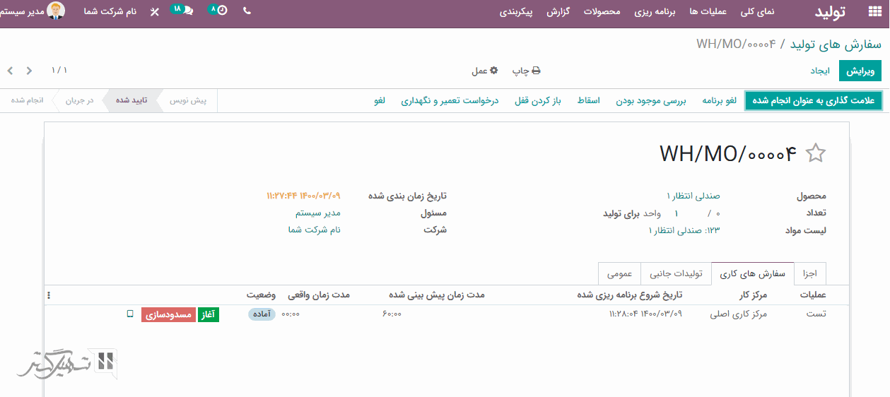 هنگامی که لیست مواد را انتخاب کنید، مرکز کار و عملیات تعریف شده در لیست مواد به طور خودکار پر خواهند شد. اکنون می توانید با کلیک بر روی دکمه "تایید" سفارش فروش را تأیید کنید.