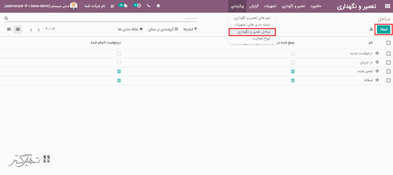 ما می توانیم مراحل مختلف نگهداری را از ماژول تعمیر و نگهداری مدیریت کنیم، برای این کار به ماژول تعمیر و نگهداری> پیکربندی> مراحل تعمیر و نگهداری بروید و بر روی دکمه "ایجاد" کلیک کنید. می توانید مرحله را به عنوان "درخواست انجام شده" علامت گذاری کنید. و یا اگر می خواهید مرحله را پنهان کنید، گزینه "جمع شدن در مرحله تعمیر و نگهداری" را تیک بزنید: