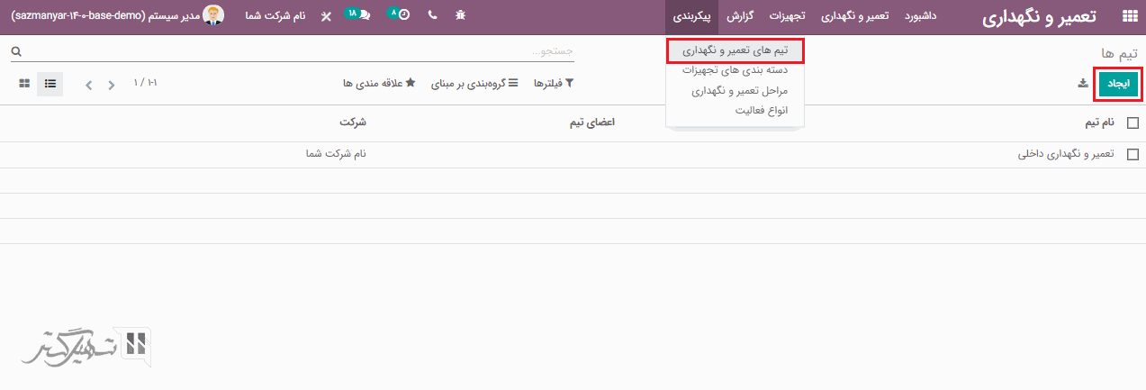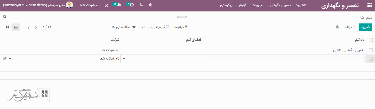 به ماژول تعمیر و نگهداری> پیکربندی> تیم های تعمیر و نگهداری بروید و بر روی دکمه "ایجاد" کلیک کنید. سپس می توانید نام تیم، اعضای تیم و شرکت را اضافه کرده و بر روی دکمه "ذخیره" کلیک کنید.