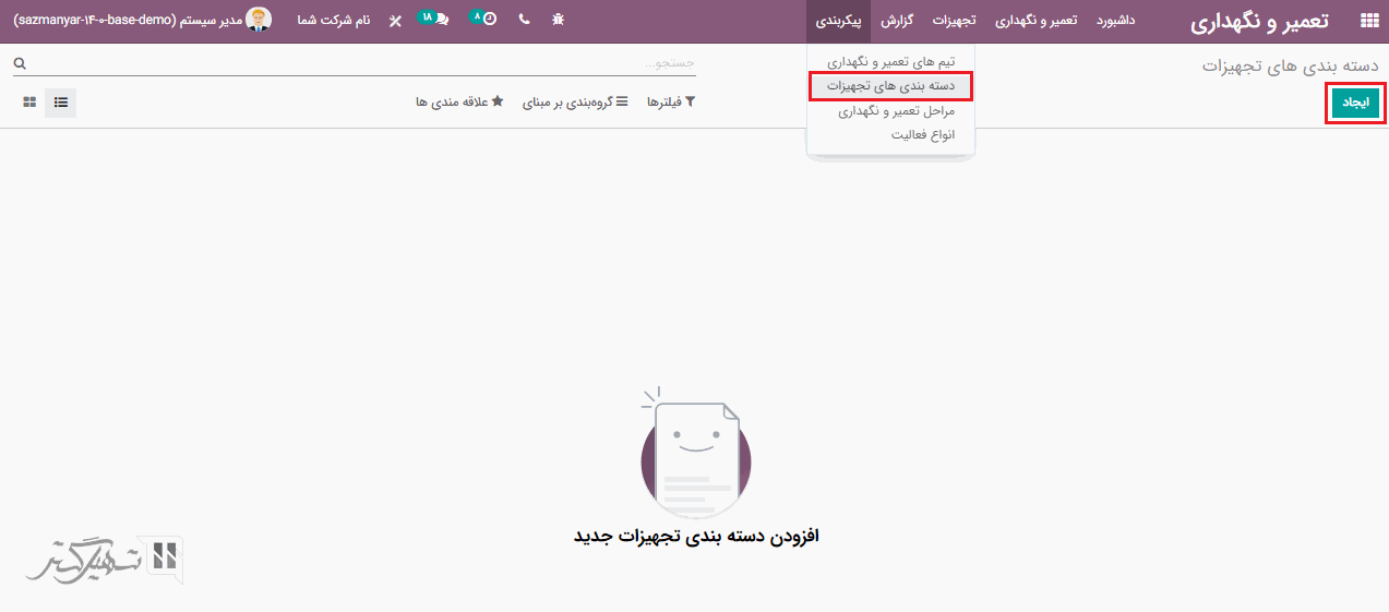 هنگام افزودن تجهیزات، می توانید دسته بندی آن را نیز تعریف کنید. دسته بندی تجهیزات را می توان از طریق ماژول تعمیر و نگهداری> پیکربندی> دسته بندی تجهیزات> با کلیک بر روی دکمه "ایجاد"، ایجاد کرد.