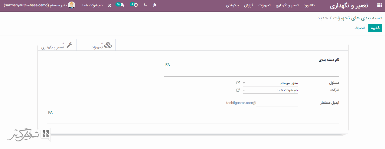 در فرم ایجاد می توانیم نام دسته بندی، یک فرد مسئول، شرکت و ایمیل مستعار را به گروه تجهیزات اختصاص دهیم: