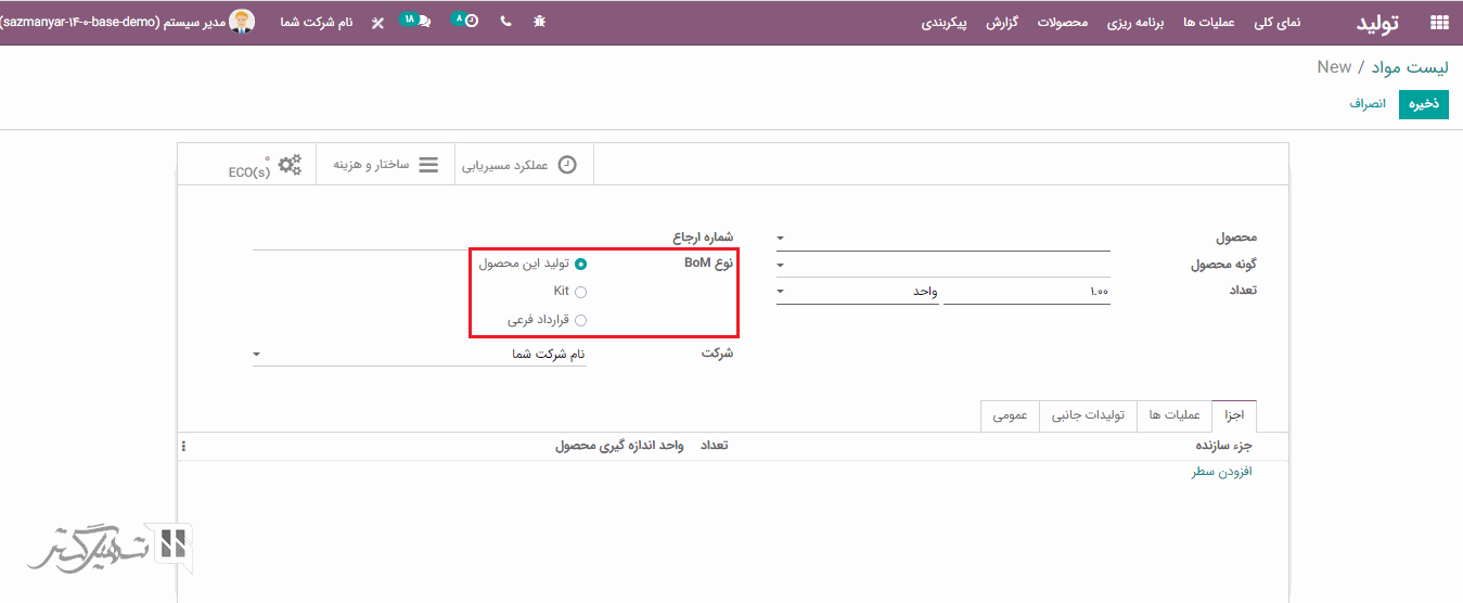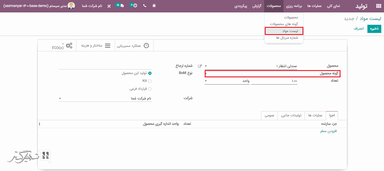 در فرم ایجاد، محصول، گونه محصول (اگر گونه ای برای این محصول انتخاب نمایید، این لیست مواد تنها برای گونه مشخص شده استفاده خواهد شد)، تعداد و نوع BOM را بر اساس (تولید این محصول) اضافه کنید.