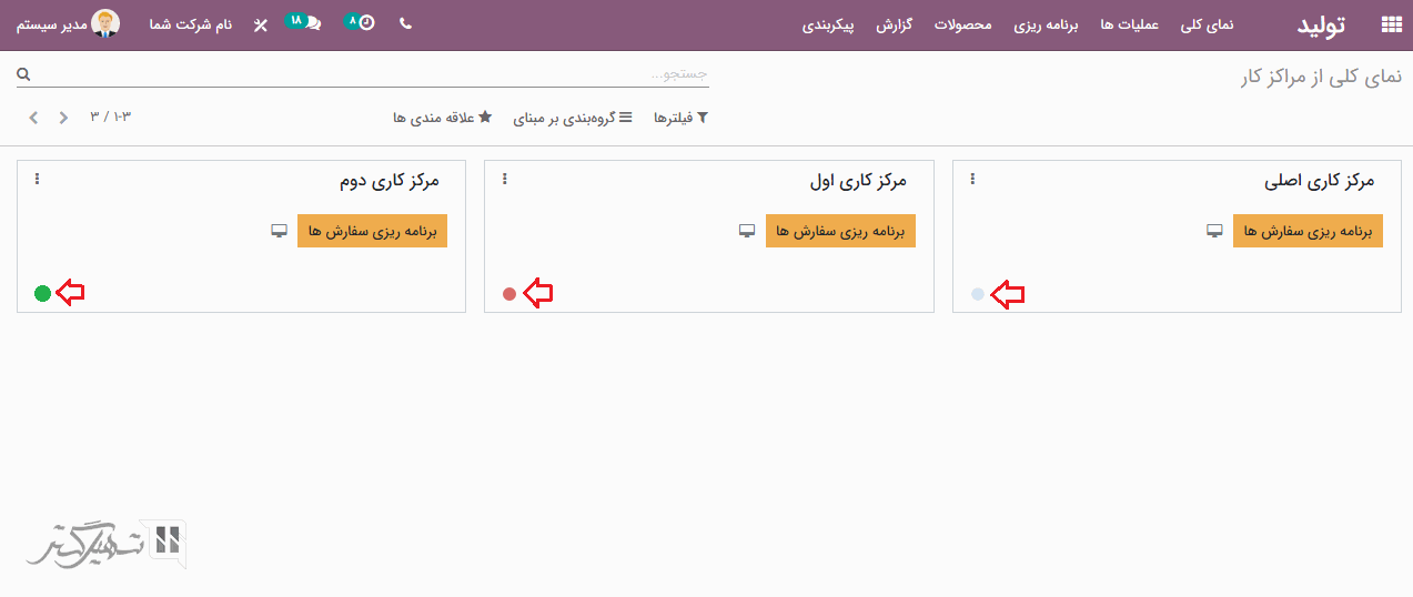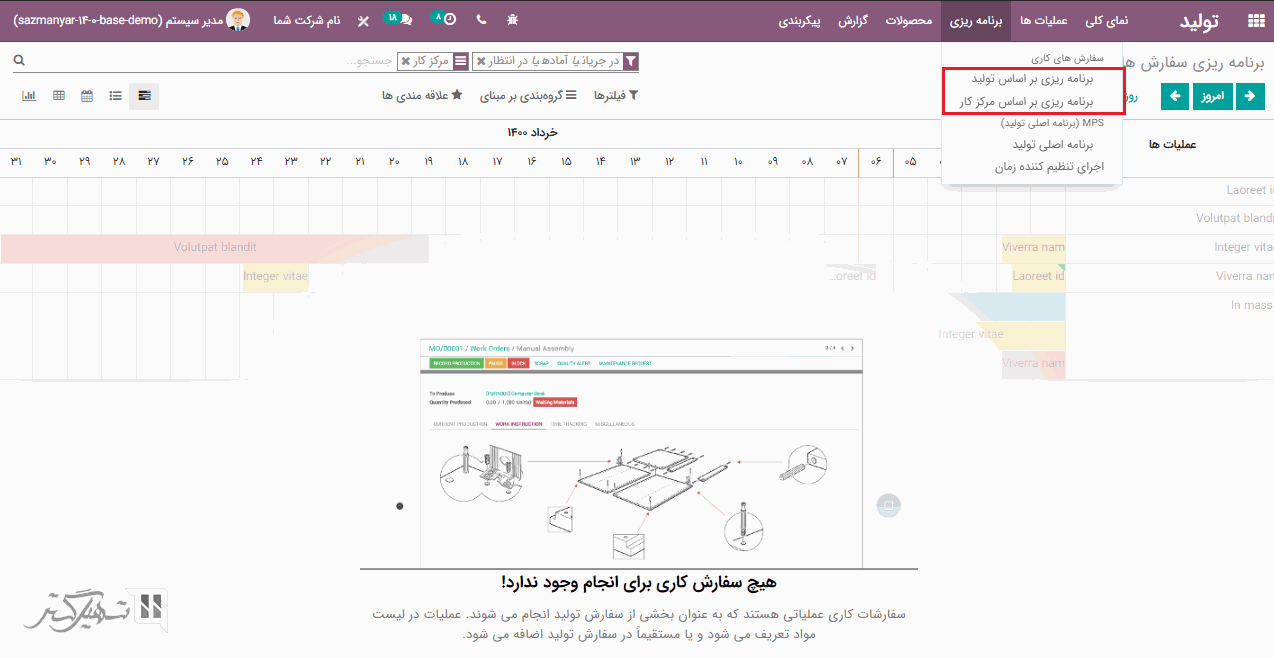 به ماژول تولید> برنامه ریزی> برنامه ریزی بر اساس مراکز کار بروید، می توانید سفارش های کاری برنامه ریزی شده را در هر مرکز کاری مشاهده کرده و در نمای نمودار گانت تجزیه و تحلیل کنید. علاوه بر این، می توانید از طریق ماژول تولید> برنامه ریزی> برنامه ریزی بر اساس تولید را نیز مشاهده کنید.