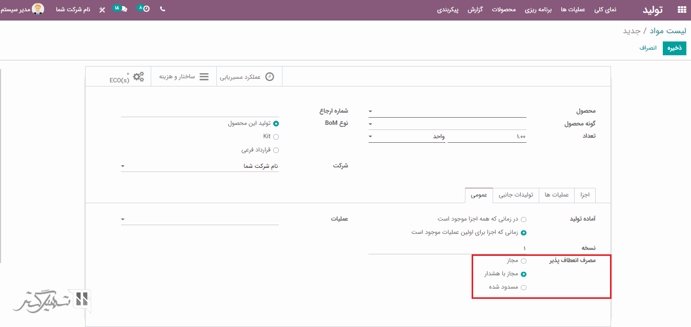 در تب عمومی ، قابلیت آماده تولید را می توان بر اساس "در زمانی که همه اجزا موجود است" یا "زمانی که اجرا برای اولین عملیات موجود است" تنظیم کرد. فیلد نسخه لیست مواد به طور خودکار پر خواهد شد و مصرف انعطاف پذیری را می توان بر اساس (مجاز / مجاز با هشدار / مسدود شده) انتخاب کرد.